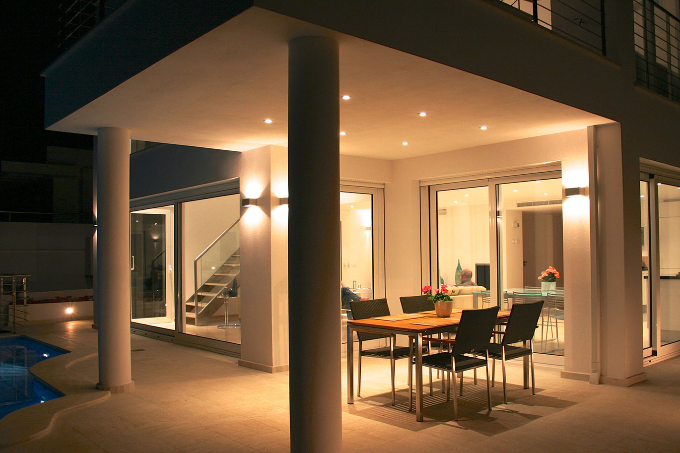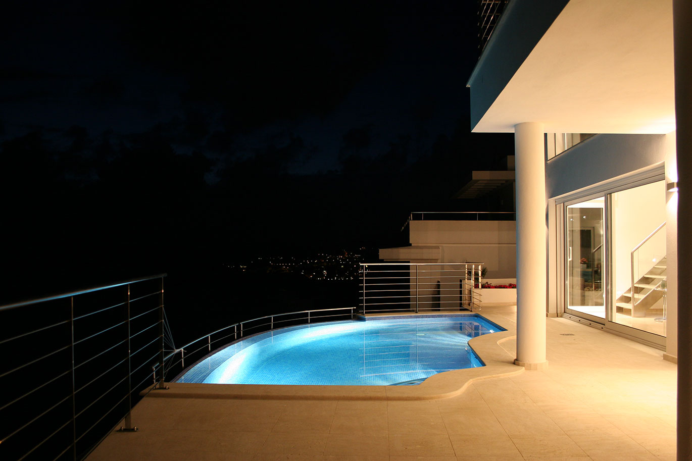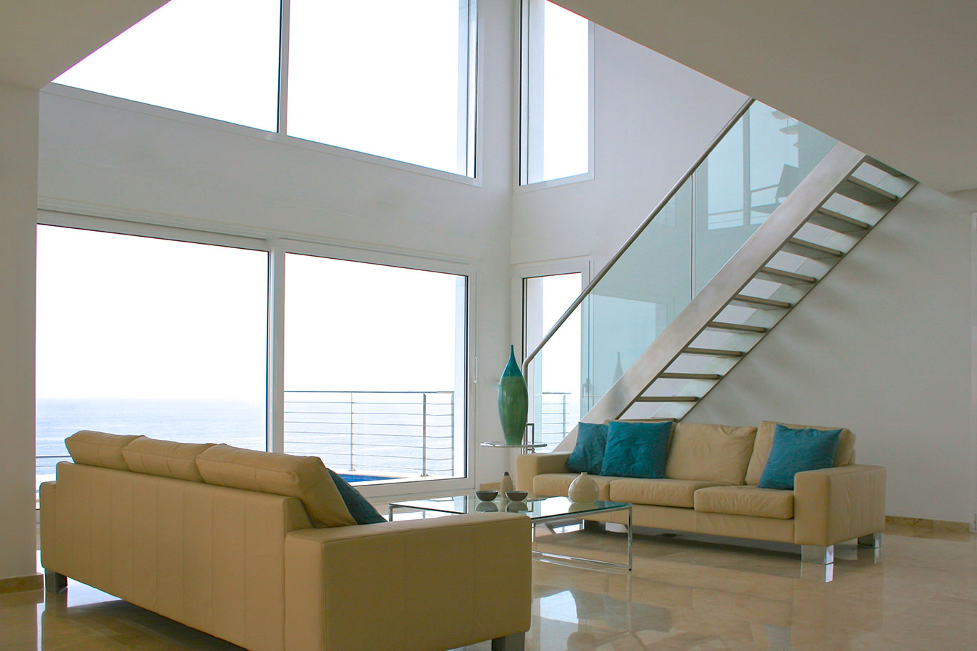 To achieve this, we turned the house on its side and located the four bedrooms on the street side of the house, with two at ground level and two on the first floor. These rooms all have mountain views. The rear half of the house is dedicated entirely to open plan living space arranged on two floors around a double height space over the sitting area. This space is filled with light and a reflected blue from the sea.