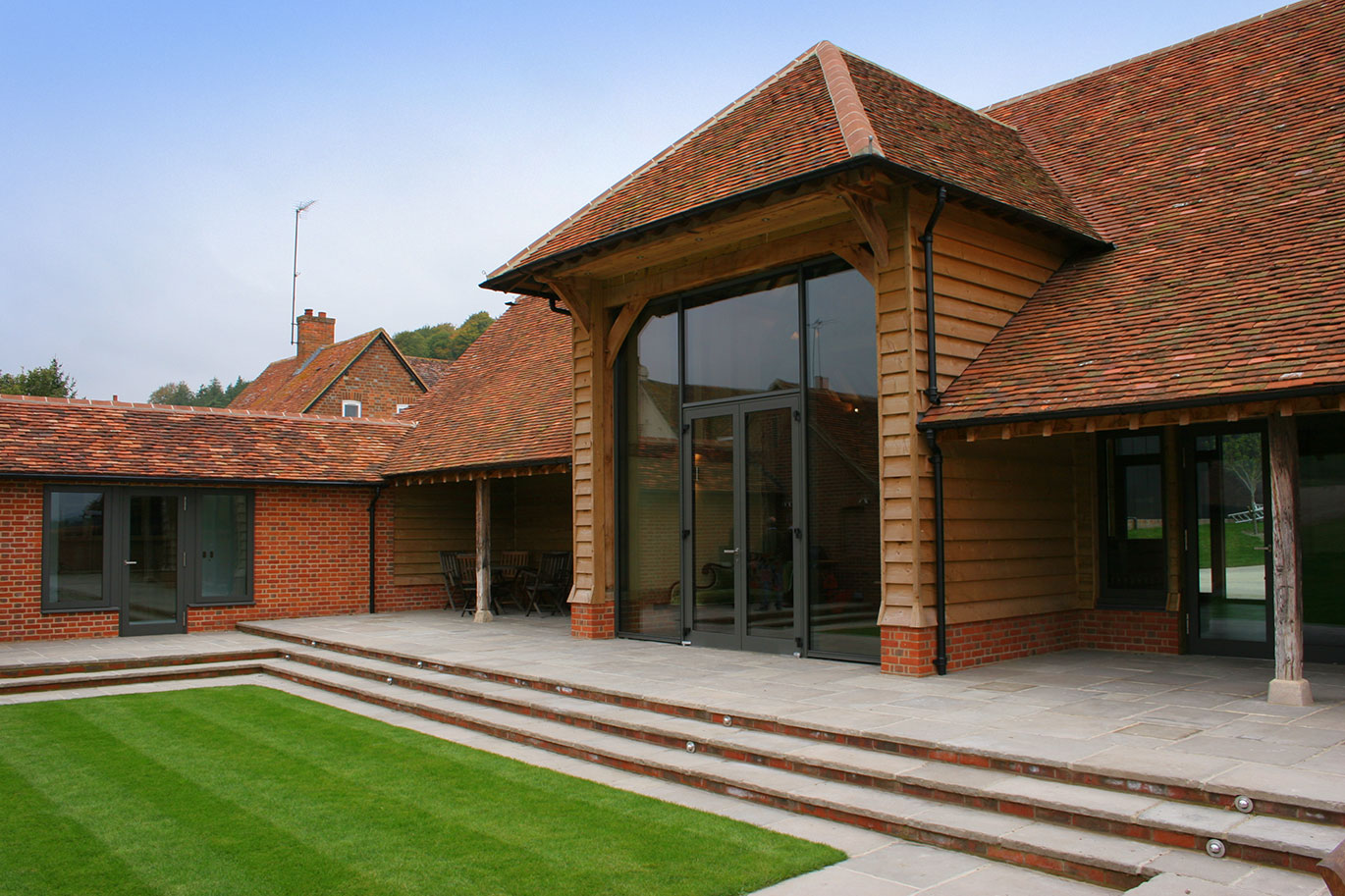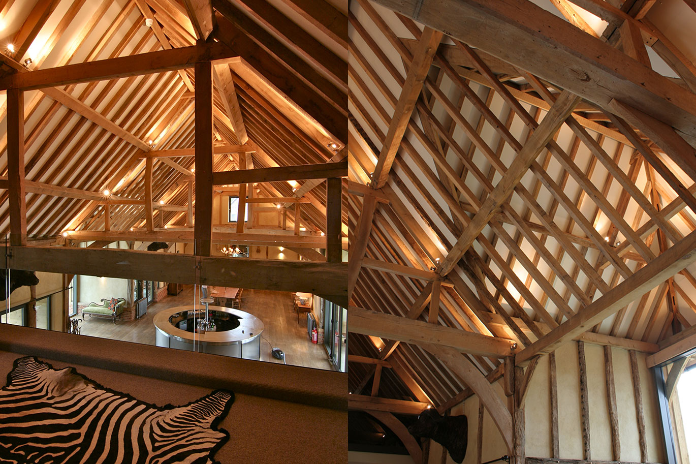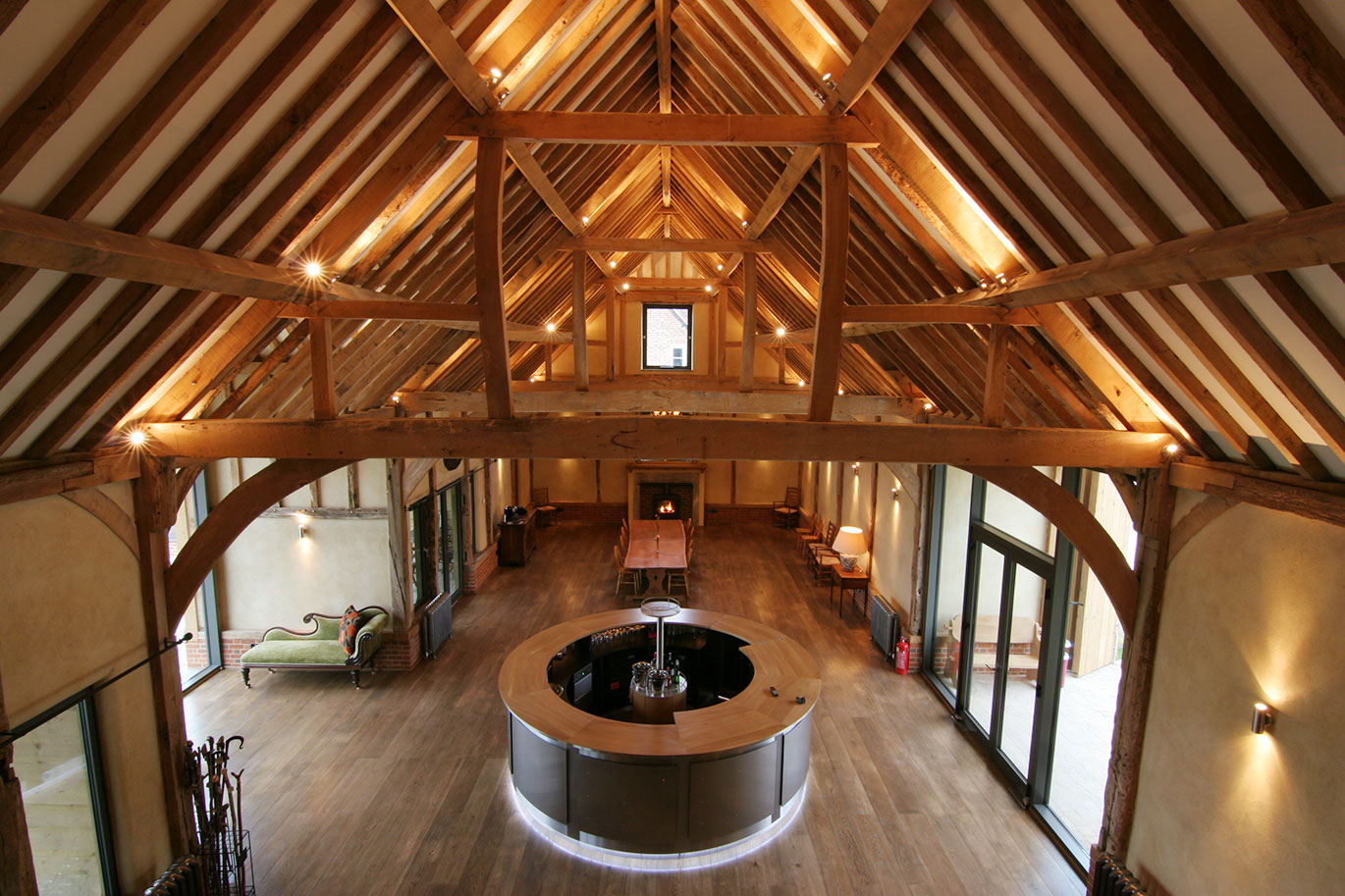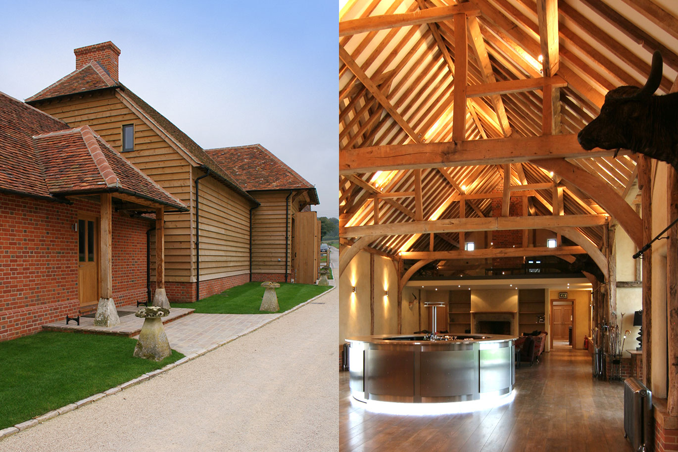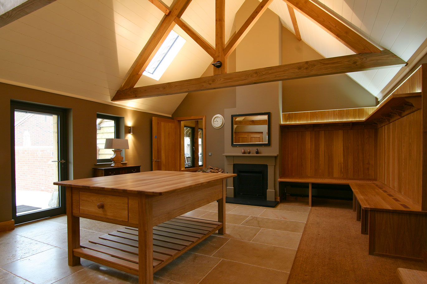 The palate of materials for this project was chosen to complement the original oak and elm structural members of the barn and included stone flagged and oak boarded floors.